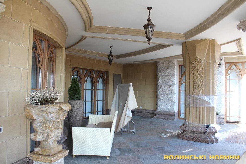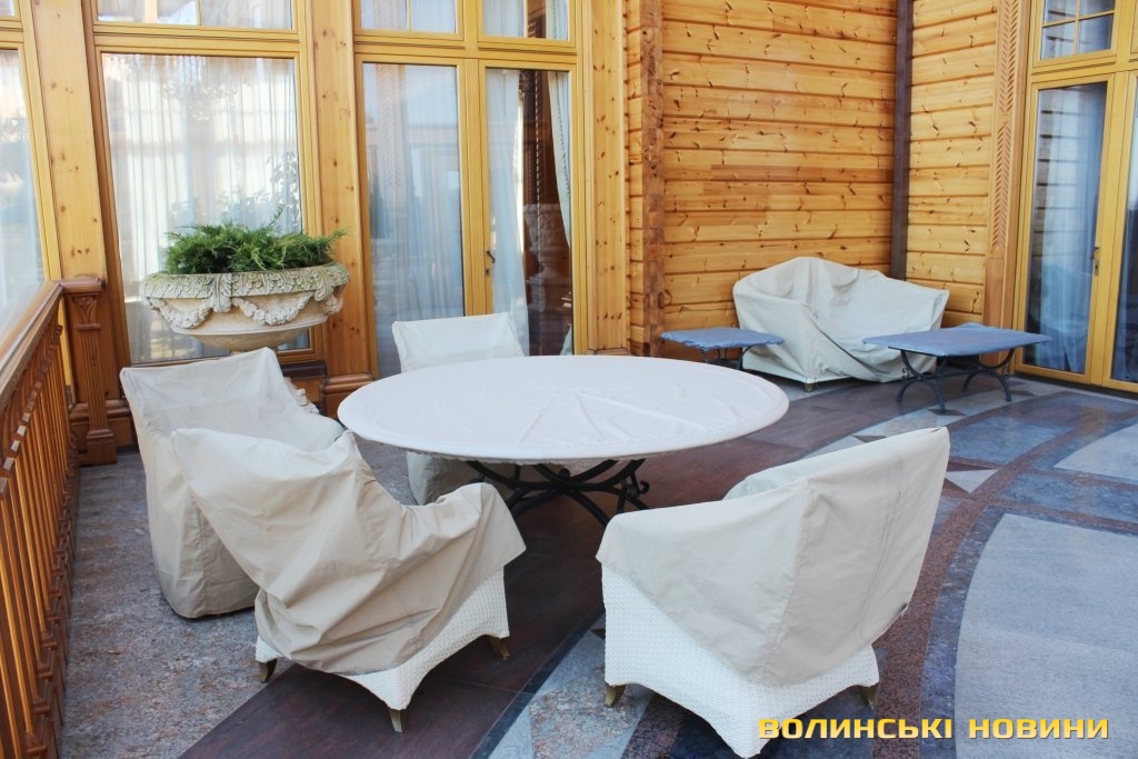Оглянувши кухню, проходимо у кімнату, призначення якої екскурсоводу невідомо. Неодмінні атрибути красивого життя – камін, годинник, позолочені люстри, телевізор Panasonic з широкою діагоналлю, звичайно, присутні. Звідси можна вийти на величезний балкон спальні, на якому можна організовувати цілі бенкети – стільців та столів, дбайливо захованих у футляри, достатньо. З цього царського балкону відкривається краєвид на маєток та Дніпро.