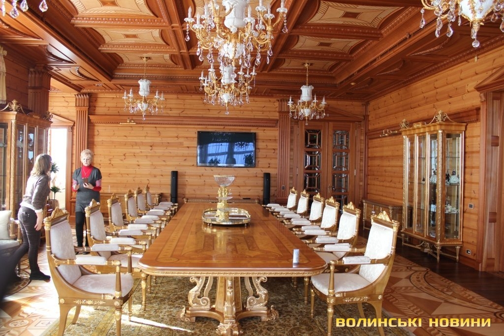 Заходимо в їдальню, розраховану на чималу кількість осіб. В оздобленій деревом кімнаті за довгим столом – 12 стільців, на стіні – знову телевізор. В опечатаних креденсах – порцелянові статуетки, на стелі багато люстр, як і скрізь, з позолотою.