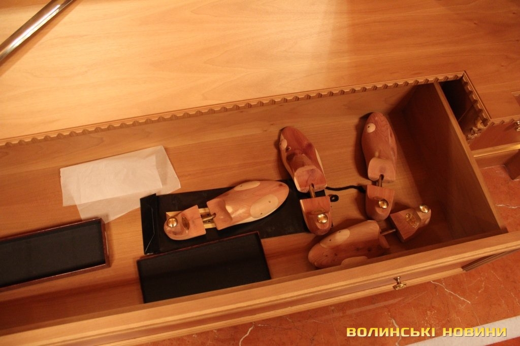 Завітавши до ще одного спорожнілого гардеробного приміщення, бачимо там сейф. У шухлядах, окрім порожніх упаковок з-під майок та інших предметів одягу, – свідчення про забобонність мешканця Межигіря – копійки, яких знайшли чимало практично в усіх шухлядах будинку. Зі слів Олеся, п’ятий поверх будинку – суцільний гардероб, проте ми не підніматимемося туди, щоб не гаяти час.