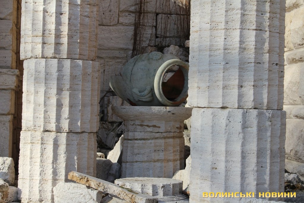 «Поглянь, це ж руїни Херсонесу», - один з відвідувачів Межигір’я звертається до своєї супутниці, вказуючи на химерну композицію з колон, виготовлених «під давню Грецію». Поблизу них можна побачити розбиту амфору та декілька скульптур. Якими естетичними переконаннями керувався той, хто вирішив поєднати ці «руїни» з будинком, оздобленим деревом, невідомо. Може, ідея належала самому власнику цього «забороненого міста»? Думка про те, що дизайн п’ятиповерхової будівлі та її приміщень розробляли згідно планом власника маєтку, виникатиме ще неодноразово. Будинок має два входи, що, завдяки горбистому рельєфу місцевості, розташовані на різних рівнях.