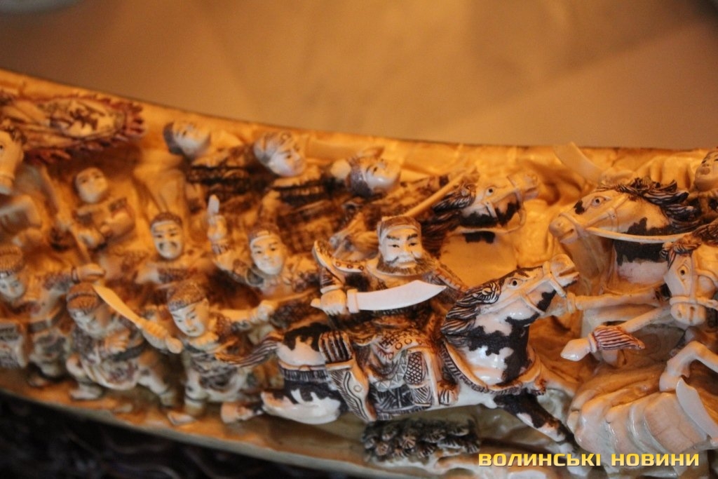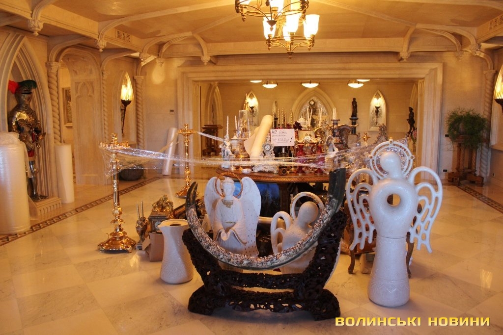 Вже у цьому приміщенні стартує екскурсія – у центрі залу зібрані цінні речі, які бійці Самооборони виявили у будинку. Дотепна табличка-застереження наголошує «не будь Януковичем: не кради!» Серед речей – бивень мамонта з майстерно вирізьбленими сценами військового походу монголів, мозаїки з бурштину, маска лисиці (чи дізнаємося ми коли-небудь для чого вона слугувала власнику?), скульптури ангелів, церковна атрибутика, настільні годинники з порцеляни, дорогі підсвічники та вази, ікони, картини, колекційні тарілки, розфарбовані яйця, пляшки з елітним алкоголем, а також жорсткі диски комп’ютера. Насправді, це дещиця з того, чим був наповнений будинок, - переконує екскурсовод. Предмети піддадуть експертизі, опишуть, а згодом їх зберігатимуть, можливо, у якомусь музеї. Варто зауважити, що вартість одного лише бивня мамонта з такою майстерною різьбою становить не один десяток тисяч доларів.