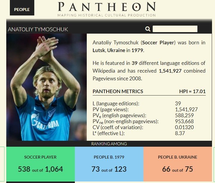 Команда американських дизайнерів, інженерів і вчених створила некомерційний проект The Pantheon з метою математично проаналізувати глобальну культурну спадщину. Для визначення світової популярності історичних особистостей The Pantheon використовує складну методику з двоповерховими формулами. Зокрема, підраховується кількість мовних версій біографічної статті в «Вікіпедії» і число їхніх переглядів. Належність до країни визначають за місцем народження.