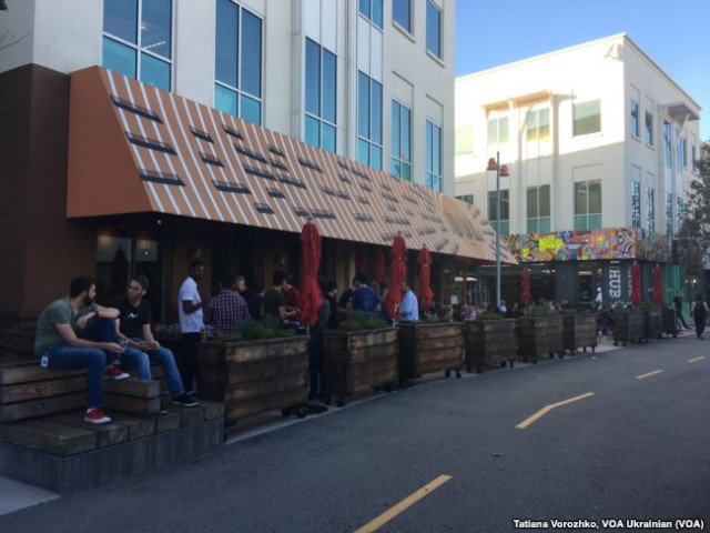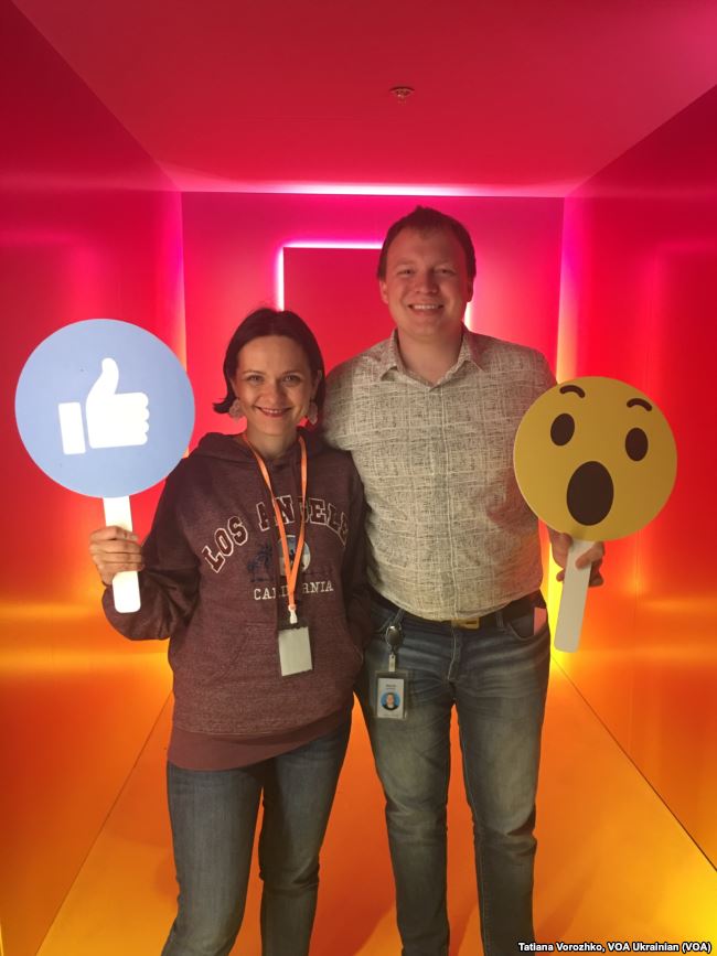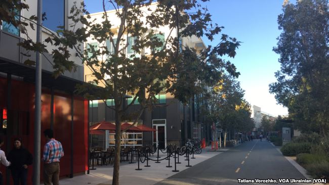 Журналіст "Голосу Америки" Тетяна Ворожко: "Під час поїздки до Каліфорнії я заїхала подивитися на містечко-штаб-квартиру (кампус) компанії Фейсбук. Як таких екскурсій там немає, але, маючи знайомого працівника, можна потрапити в середину. Менло-Парк, де знаходиться компанія, – десь в годині їзди від Сан-Франциско (35 хвилин без заторів, але таке буває тільки вночі). Пропустити – неможливо. Ось цей знак дає зрозуміти, що ви – на місці. Вхід – через будь-яку будівлю. Мій знайомий, Микита Сафроненко, який нещодавно приєднався до лав працівників Фейсбуку, вже чекав мене на вході будинку номер 10. Аби потрапити до кампусу, відвідувачам необхідно підписати договір про нерозголошення таємниць, які раптом можна дізнатися під час візиту. Далі тобі дають бейдж і ти опиняєшся… у Діснейленді для дорослих".Відчуття Діснейленду не випадкове. Частина кампусу, яка відкралася у 2015-му році, була спроектована так, щоб виглядати як щось середнє між головною вулицею в Діснейленді та центром міста Пало-Альто.