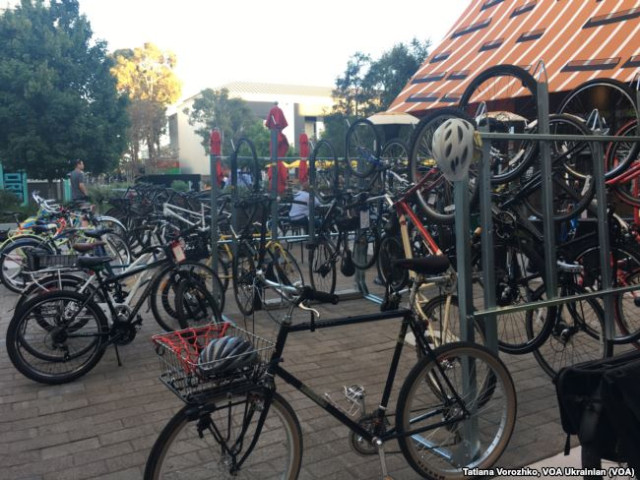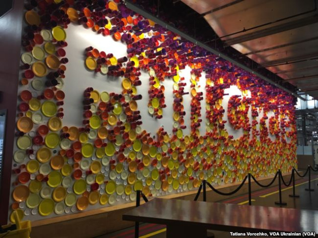 Також по всьому містечку розташовані автомати з їжею та напоями, а ще - полиці із закусками. Повечеряли ми в головній їдальні кампусу. Їжа – дуже смачна, а тістечко з інжиром виявилося просто феноменальним.Через постійну присутність смачної та безкоштовної їжі важко не набрати вагу. Працівники навіть придумали спеціальну назву для 15 фунтів (майже 7кг), які новачки набирають за перший рік роботи в компанії - «Фейсбук 15». Триматися у формі фейсбучники можуть за допомогою велосипедів, які компанія позичає безкоштовно (як також і шоломи), басейну, місцевого спортзалу, студії йоги та бігових доріжок.Але найкраще – прогулятися в парку на даху будинку або пограти у футбол на полі … теж на даху.Інші безкоштовні та субсидовані послуги навіть важко перерахувати. Кабінет лікаря. Станція техобслуговування. Майстерня з ремонту велосипедів. Стоматолог (наїздами). Банк. Перукарня. Музичний центр. Деревообробна майстерня. Пральня та хімчистка. Масажні кімнати. Консультації юриста та фінансиста. Клуби за інтересами. Гральні автомати.А ще є ось такі торгові автомати для батарейок, навушників, зарядних пристроїв та інших дрібниць. Зрозуміло, що монетки в нього кидати не треба.Є тут навіть кімната для перепочинку працівників. Для компанії, яка працює 24/7, це може бути необхіднім елементом.Один з будинків Фейсбуку має найбільший у Північній Америці відритий офіс. Виглядає це як заводський цех з офісними столами. Відкритий він цілодобово – люди працюють за різними графіками - але о сьомій вечора ми побачили лише жменьку працівників, усе ще зосереджених на роботі.Один з них – програміст Остап Коркуна. Каже, його завдання, аби не падав Фейсбук. Він у компанії з 2009-го року.Ще двох українських інженерів ми зустріли на мосту, що поєднує офісні будинки. З 17 тисяч працівників компанії Фейсбук (загалом) українців, каже Сафроненко, лише близько 100 і далеко не всі працюють саме на кампусі в Менло-Парк. Але в українців є талант скрізь знаходити своїх.Через відкритий план офісних приміщень, працівників заохочують використовувати численні кімнати для переговорів. В офісі WhatsApp - особливо тихо.Тут же на стіні – історія компанії, співзасновник якої – уродженець м. Фастова, Київської області, Ян Кум. У 2014-му році він продав компанію, яка створила додаток для обміну повідомленнями, Фейсбук за 19.3 мільярди доларів. Ставши мільярдером у віці ще до 40-ка років, він продовжує працювати вже у Фейсбук.Над багатьма робочими місцями можна побачити кульки у формі цифр. Їх дарують працівникам в річницю прийому на роботу.Скрізь на кампусі – картини та настінні розписи сучасних митців. Серед них кілька зображень та навіть статуя лисиці. За місцевою легендою, лисиця народила дитинчат на території кампусу і стала чимось на зразок місцевого талісману.Єдине, чого на кампусі я не знайшла, так це – дитячого садочку та ясел. Втім, тут є кімнати для зціджування молока та місця для паркування виключно для вагітних жінок. Також компанія надає працівникам 4 тисячі доларів по народженню дитини і частково компенсує витрати на догляд за дитиною (три тисячі доларів на рік, що покриває витрати на ясла чи няню за 2-3 місяці). Працівники компанії – як жінки, так і чоловіки – мають право на повністю оплачувану чотирьохмісячну відпустку в будь-який час протягом першого року життя дитини. Для порівняння, 