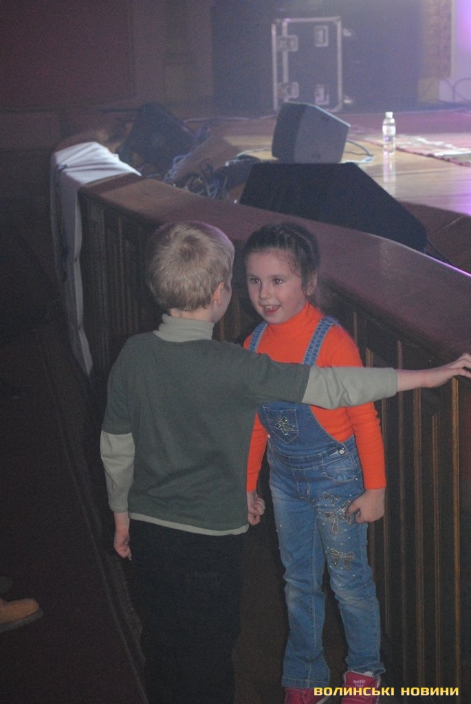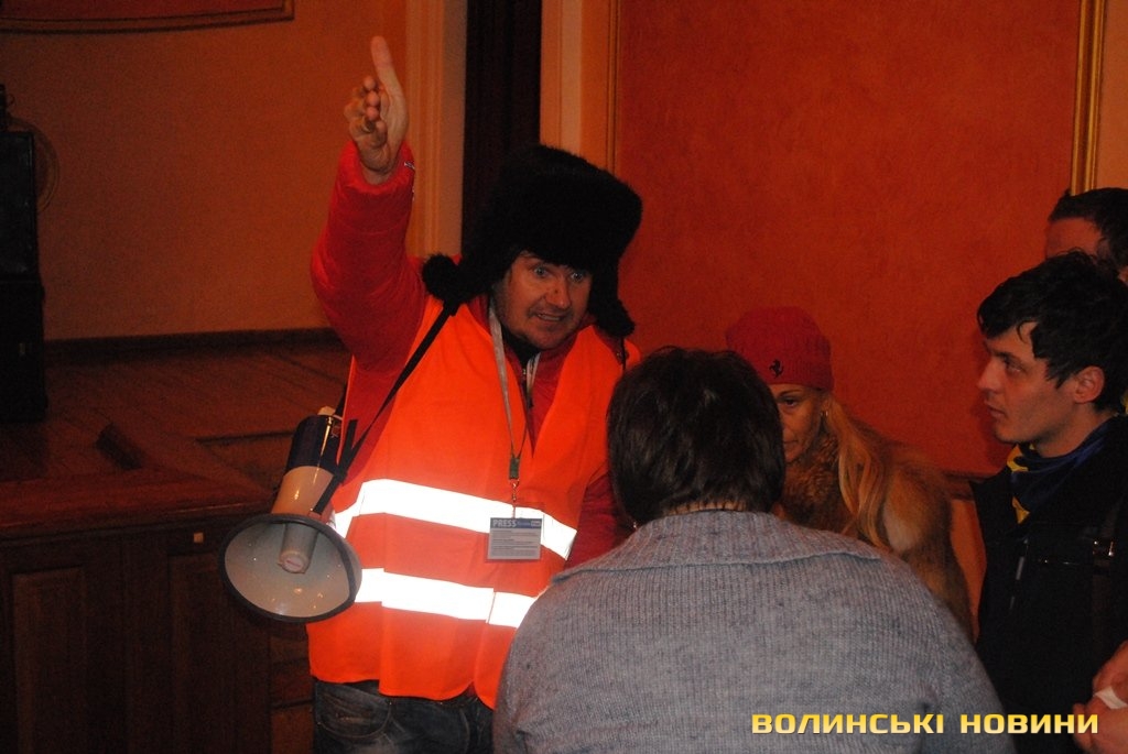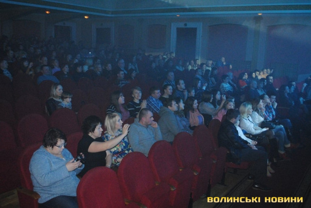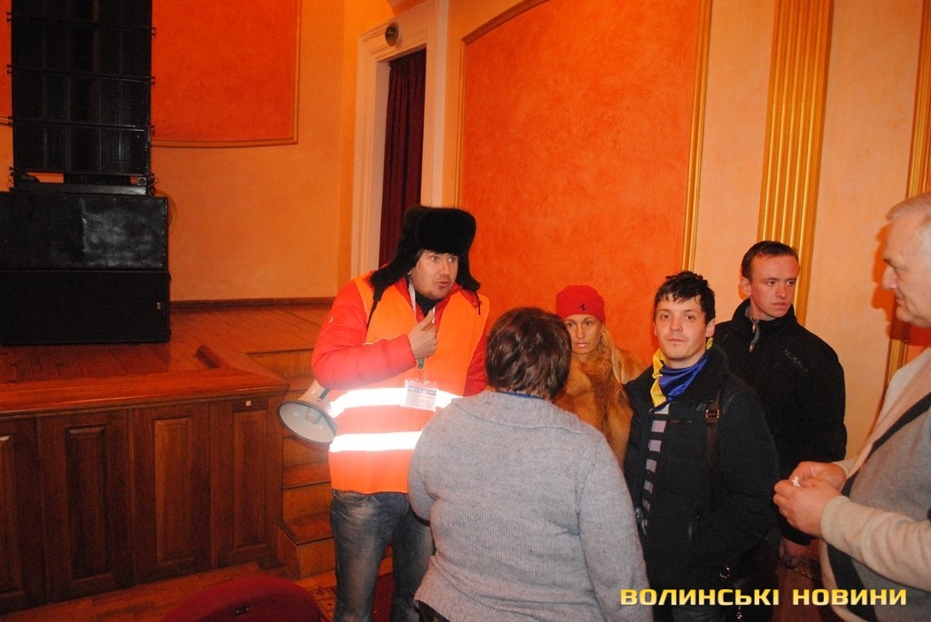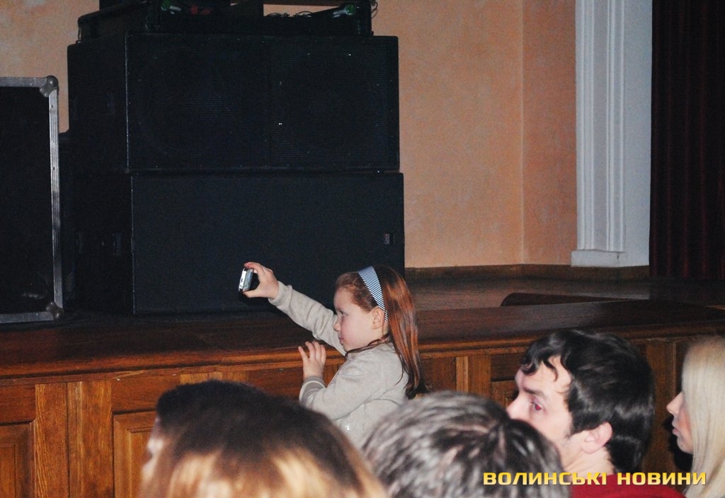 Було багато диму, танців, дітей, квітів, допоки до залу не зайшли активісти луцького Євромайдану – їх було чоловік 20. Недоспівана композиція, сирена на весь зал у гучномовець – музиканти таки закінчили пісню, однак виглядали вони при цьому дуже спантеличено.