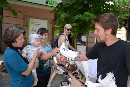 Артем назвався мандрівним голубівником із Чернівців. Його хобі – їздити містами з птахами, заодно спілкуватися з колегами, які розводять голубів і тішити туристів та міщан. Лучани, каже, реагують привітно. Хоча старшого віку жінка у перший день його появи на Лесі Українки викликала поліцію.