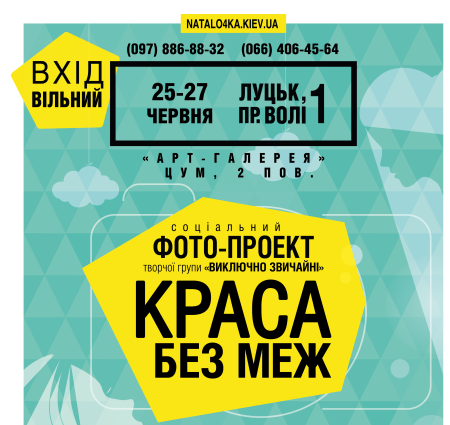 Всі охочі безплатно зможуть відвідати відкриття виставки соціального фотопроекту «Краса без меж». Відкриття відбудеться 25червня в «Арт-галереї» ЦУМ (проспект Волі, 1). Початок заходу о 16:00.