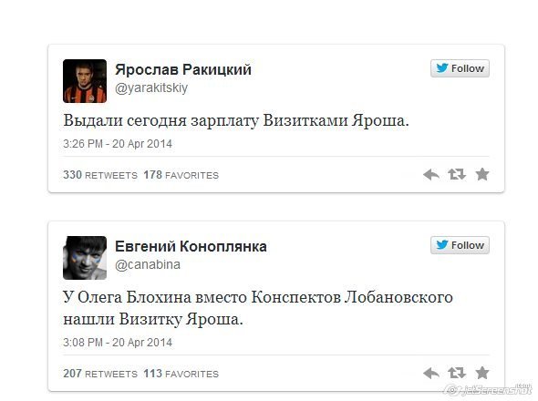 Наши СМИ забыли добавить то, что вместе с визиткой обнаружена бляха ПС с порядковым номером, равным 20. Удивительно ли при этом, что убитый под Славянском лично знаком с Ярошем?