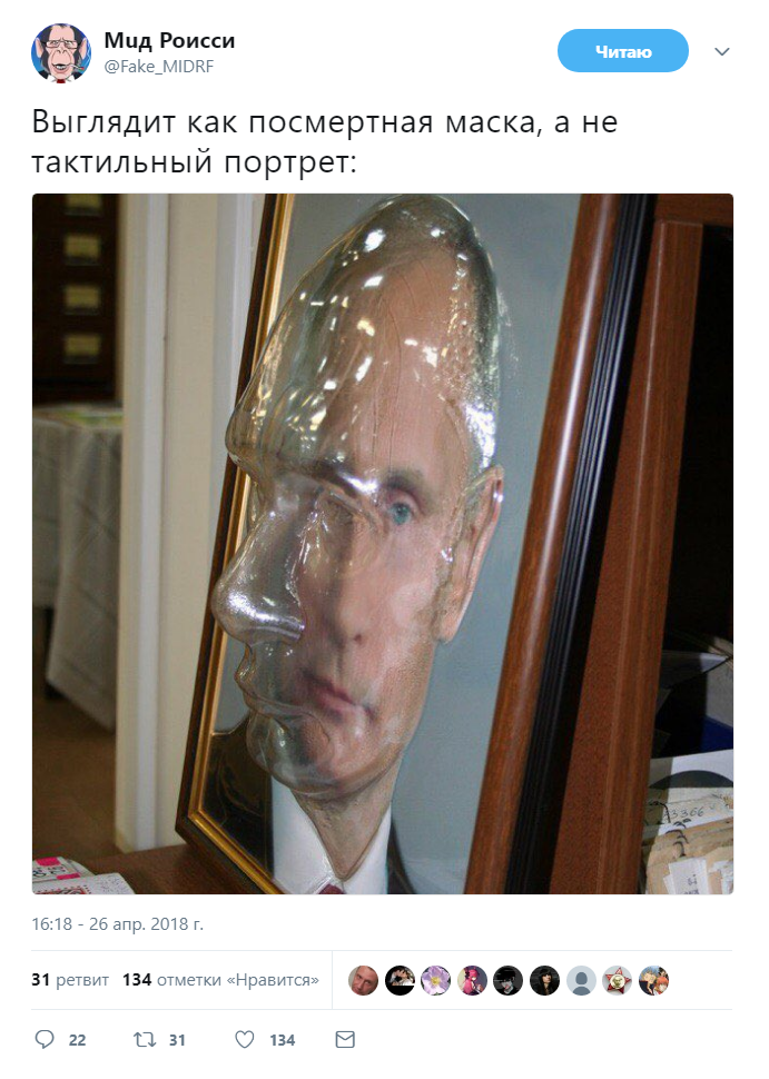 «Виглядає як посмертна маска, а не тактильний портрет», «От це прогин, так прогин», «Швидше б насправді йому зробили таку маску!», - пишуть в інтернеті.