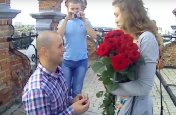 Мешканець Рожищенського району Сергій Олійник освідчився своїй коханій, 21-річній рожищанці Юлії Зарадюк на в'їзній вежі Луцького замку