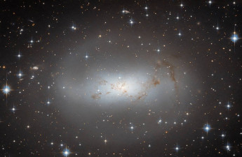 Ця галактика розташована на відстані приблизно 11 мільйонів світлових років від Землі і складається з яскравої хмари зірок та слабкого звивистого «вусика» темного газу та пилу.