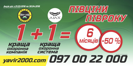 У компанії "Явір-2000" стартує всеукраїнська весняна акція "Півціни - півроку". Тож можна суттєво зекономити: замовити охоронну сигналізацію від "Явір-2000" з 1 березня по 30 квітня й отримати 50% знижки абонплати на півроку.