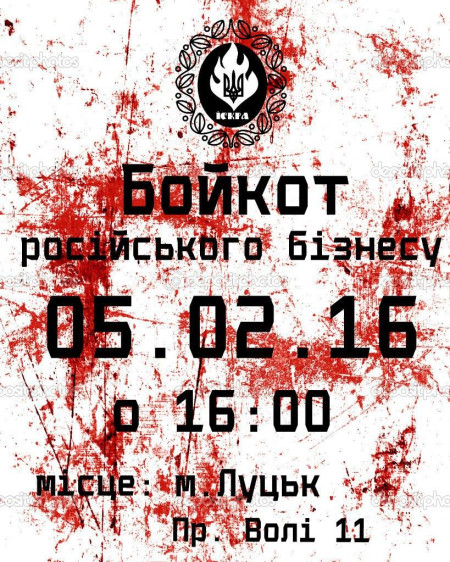 У Луцьку відбудеться акція бойкоту російського бізнесу. Так, акт протесту відбудеться 5 лютого 2016 року о 16 годині за адресою проспект Волі, 11.