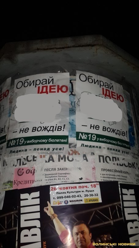 Крім того, УМВС області повідомляє, що в чергову частину Володимир-Волинського МВ УМВС України уВолинськiй областi надійшло повідомлення 37-річного місцевого жителя про те, що 26 жовтня в населених пунктах Залужжя та Стежаричі Володимир-Волинського району на деяких електроопорах виявлено частково не зірваніагiтацiйнi листівки на пiдтримку трьох кандидатiв по окружному виборчому окрузі №19.