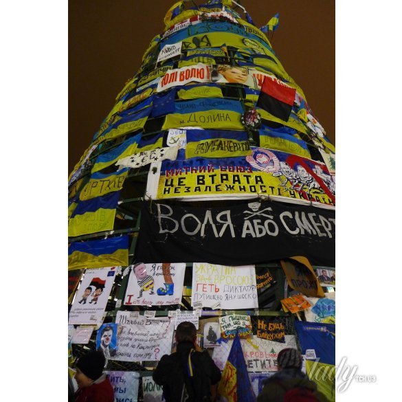 Як не крути, ялинка, вона ж "йолка ", - символ української революції . Зараз у центрі міста стоїть, здавалося б, краща столична ялинка за всі роки незалежності України. Сподіваємося, прикрашена символікою і плакатами "йолка " точно займе перше місце в рейтингу європейських новорічних дерев.