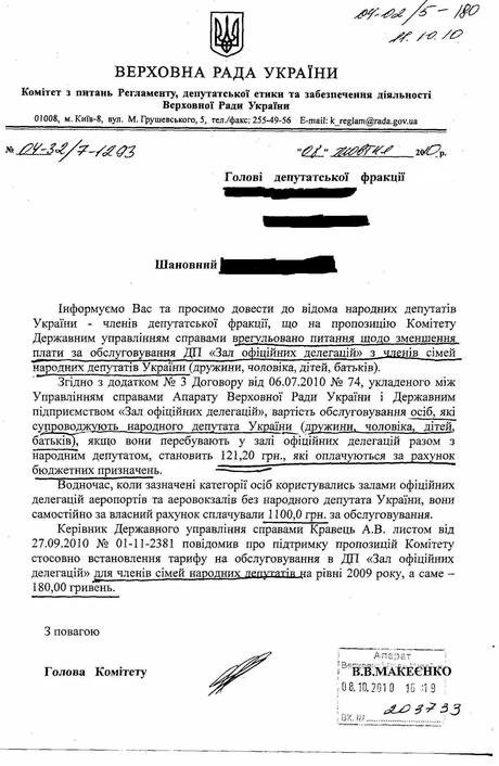 Якщо родичі депутата супроводжують парламентарія в його поїздці, то їх перебування у VIP-залі коштує 121,2 гривні і оплачується за рахунок бюджету. Якщо ж дружини, чоловіки, батьки, діти парламентаріїв прибули в аеропорт самостійно, то за обслуговування в залі офіційних делегацій вони повинні були заплатити 1100 грн.