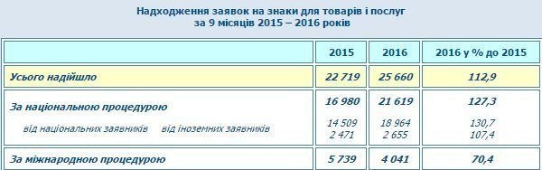 Зауважимо, за національною процедурою в Україні протягом 9 місяців 2016 року подано 25 тисяч 660 заявок на знаки для товарів і послуг.