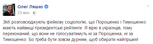 "ЗМІ поширюють фейковую соціологію, що Порошенко і Тимошенко мають найвищі президентські рейтинги. Я вірю в українців і переконаний, що вони не голосуватимуть ні за Порошенка, ні за Тимошенко. Тому що треба бути зовсім безглуздим, щоб вибирати гірших"! - написав він.