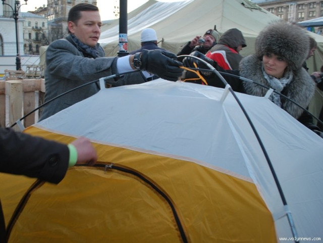По Майдану ходить нардеп Олег Ляшко. Хоч підприємці і виступають проти втручання в їхній протест будь-яких політичних сил і не шкодують висловів і у бік влади, і в бік опозиції, Ляшко на Майдан приходить не вперше. І навіть пробує вийти на сцену, хоч і безуспішно.Але у Ляшка тут - свій намет. Страйкарі, щоправда, кажуть, що усе це - піаром.