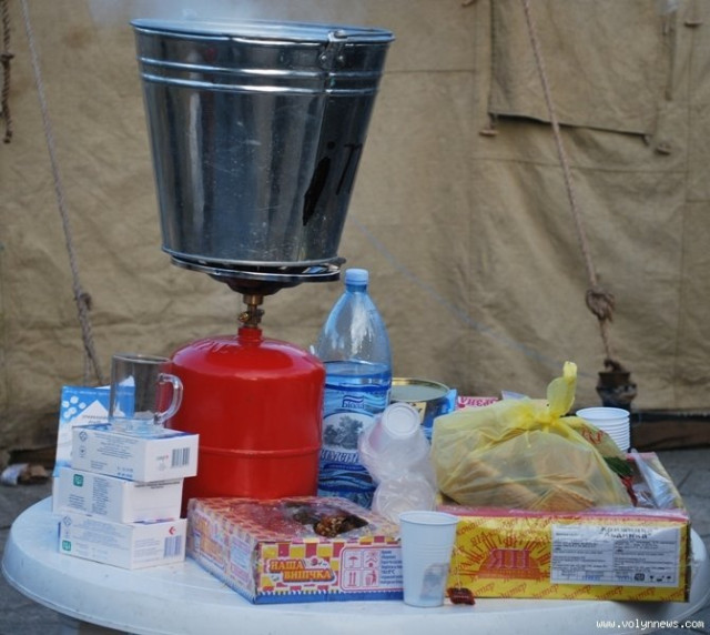 На кухні готують переважно чай, каву, канапки та бульйони. Розповідають, що продукти приносять самі ж учасники протесту.