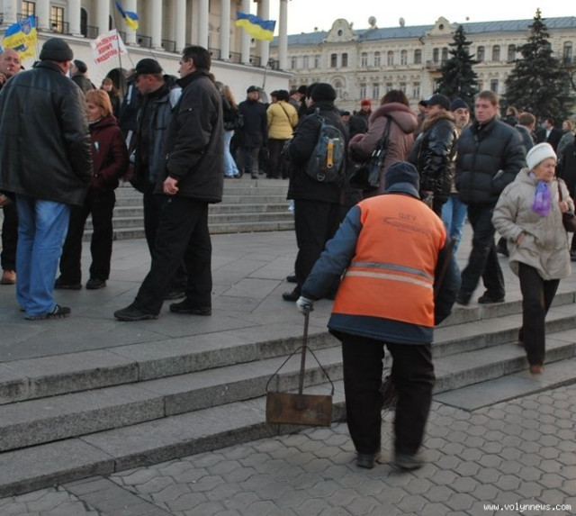 Прибиральниця Надія, замітаючи Майдан, каже, що їх на зміні після нещодавнього скорочення - всього троє. А вичистити необхідно увесь центр за півтори тисячі гривень ставки в місяць.