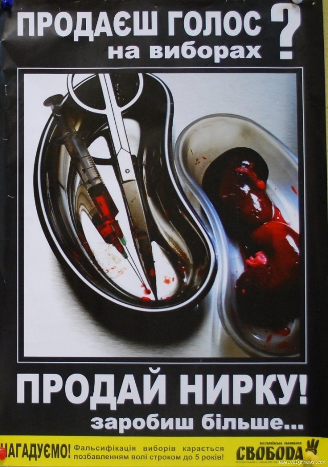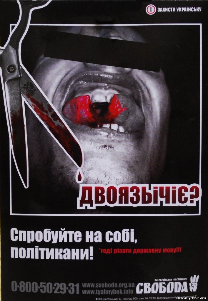Політик продемонстрував плакати, які спонукають замість голосу на виборах продати тіло або нирку. Показав Тягнибок і «криваві» наліпки, які закликають розрізати язик навпіл тим, хто домагається двомовності.