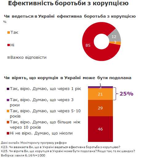 Перспективи подолання корупції українці оцінюють без оптимізму. Тільки 21% вірить, що перспектива подолання корупції – 5-10 років більш ніж чверть опитаних вірить, що корупцію в країні буде подолано мінімум через 10 років.