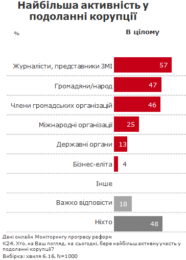 Українці вважають журналістів основними борцями з корупцією. Переважна більшість респондентів вважає, що в Україні активної боротьби з корупцією не ведеться (85%), такі дані онлайн Моніторингу прогресу реформ, що проводить TNS для Національної Ради реформ.