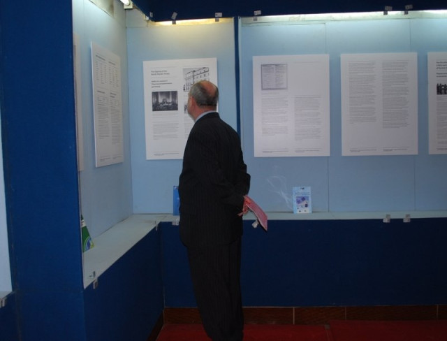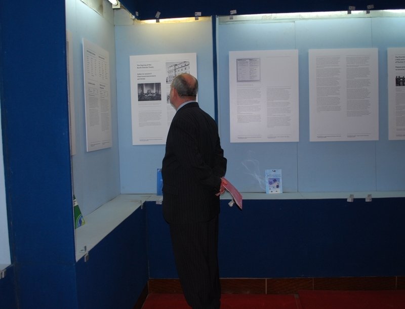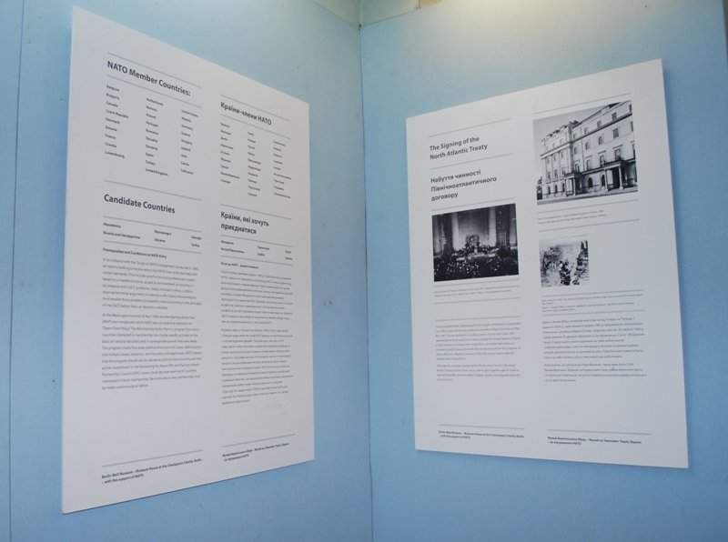 На виставці представлені фотографії історичних документів, матеріали про зустрічі країн-членів НАТО, інформація про діяльність Блоку.
