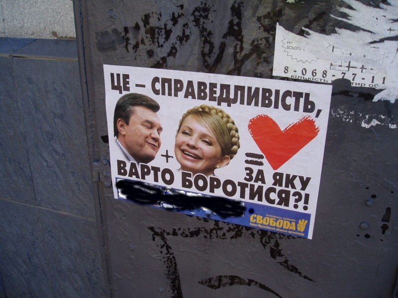 «Свобода» попереджала, що всі ці «мегаблоки» та «гігапартії» одним миром мазані, оскільки мають спільне походження: політичне (всі вони – вихідці з компартійно-комсомольської номенклатури, агентура КҐБ, кучмісти), національне (ключові гравці мають неукраїнське походження) та економічне (злочинно нажиті капітали). І ця спільність обумовила те, що сьогодні «кольорові» фантики склались не в помаранчево-біло-сердечкову, а в іншу –біло-синьо-червоно-сердечкову мозаїку – ідентичну кольорам російського триколора.