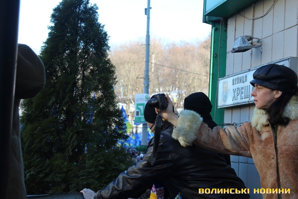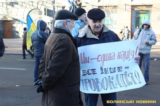 Незважаючи на це, євромайданівці намагаються докричатися до співвітчизників з «синього» табору та закликати їх переходити на свій бік. Так, велика кількість мітингувальників з Майдану Незалежності стоїть впритул до кордонів правоохоронців, скандуючи гасла «Схід і Захід - разом», «Україна – понад усе», «Крим, Донбас, приєднуйтесь до нас». Для того, щоб побачити мітинг регіоналів, євромайданівці видряпуються на металоконструкції та паркани. Дехто з учасників Антимайдану вітає їх вигуками та помахами руки. Наразі, усе відбувається мирно, без насилля та провокацій. Втім, приєднатися до майданівців учасникам Антимайдану практично неможливо – правоохоронці не лише не впускають на Європейську площу сторонніх, а й не дають змоги вийти за її межі мітингувальникам.
