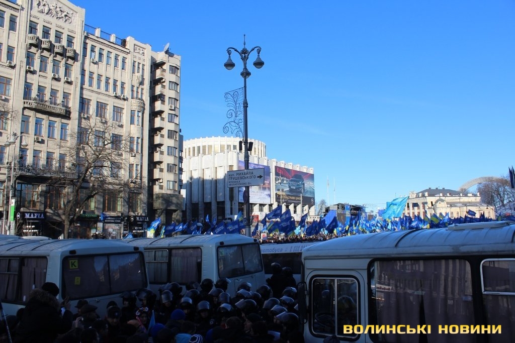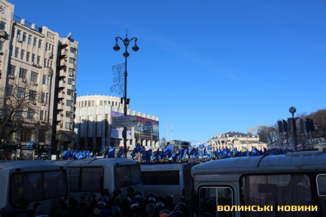 Мітинг на підтримку влади, що стартував на Європейській площі у Києві, відгороджують від міста автобуси та кордони бійців внутрішніх військ.