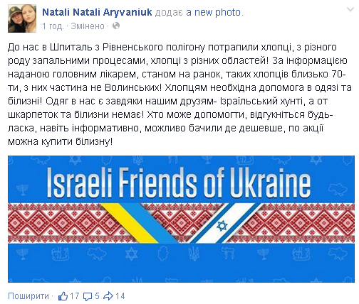 «Хлопцям необхідна допомога в одязі та білизні! Одяг в нас є завдяки нашим друзям- ізраїльській хунті, а от шкарпеток та білизни немає! Хто може допомогти, відгукніться, будьласка, навіть інформативно, можливо бачили де дешевше, по акції можна купити білизну!», - йдеться у повідомленні.
