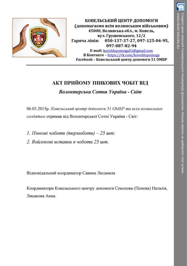 "Сьогодні отримали 25 пар пінкових чобіт (термобот) та 25 пар теплих войлокових вставок для них від Волонтерської Сотні Україна - Світ для волинських бійців. Щиро дякуємо за допомогу, адже на вулиці - весна, теплішає. Але така пора має свої мінуси: на передовій - болото і погода дуже мінлива: сьогодні сонце і тепло, а завтра - морозець... Бійцям дуже потрібні такі чоботи. В них тепло, легко, сухо і комфортно! Тримайтесь, хлопці! Ми з вами!", - йдеться у повідомленні.