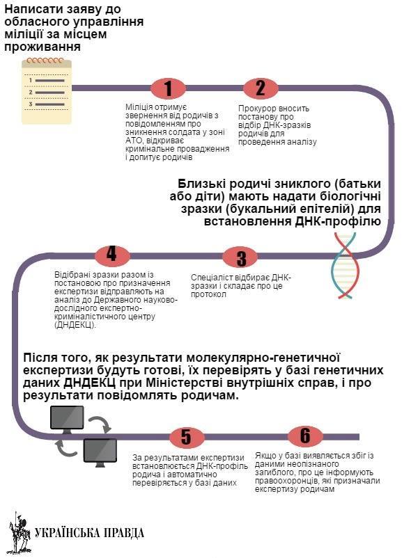 ДНК-аналіз — це не боляче. Щоб взяти зразок, лаборант має провести невеликою щіточкою по внутрішній поверхні щоки людини. Для громадян України ця процедура безкоштовна. Іноземцям доведеться заплатити близько 2,5 тисяч гривень. Направлення на аналіз отримують родичі, які написали в міліцію заяву про зникнення військового у зоні АТО.