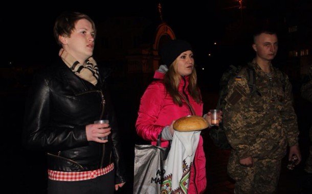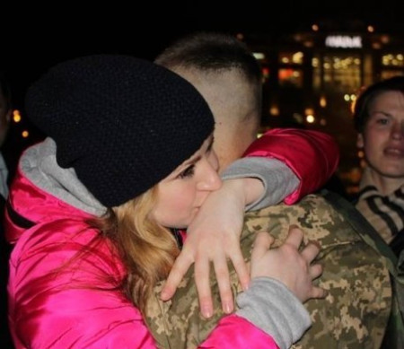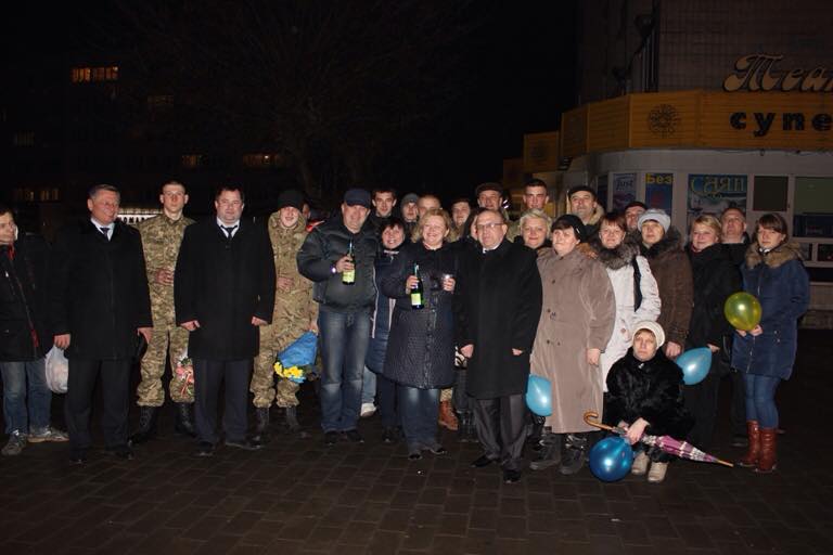 Коли під’їхав мікроавтобус із бійцями, лучани стали скандувати «Герої!» Вийшовши із транспортного засобу, юнаки відразу потрапили в обійми рідних. За старовинним звичаєм, їх зустріли хлібом-сіллю. А опісля – почастували шампанським.