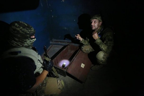 Заїхати можна тільки в темряві. Без фар. Без аварійки. Без світла в салоні. Розвантажують волонтерів "кіборги" дуже швидко. А за 10 хвилин око звикає бачити силуети. А потім волонтерів ведуть ночувати. Без ліхтарика, але навіть в темряві видно руїни.