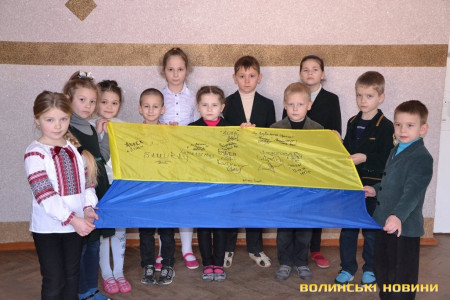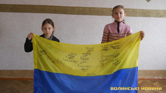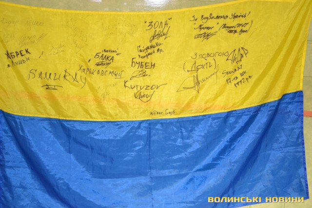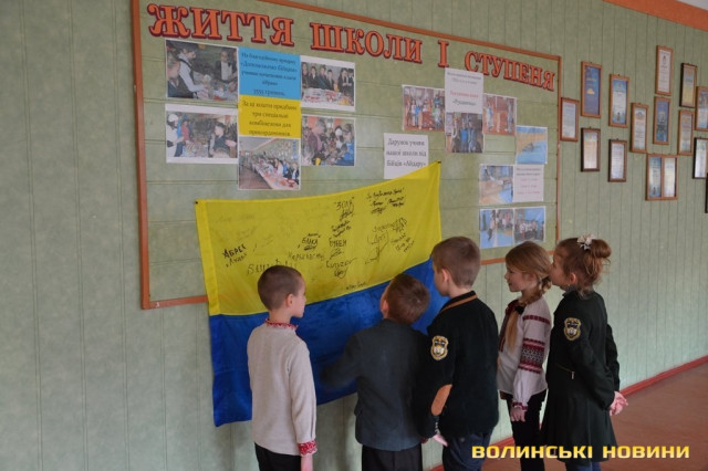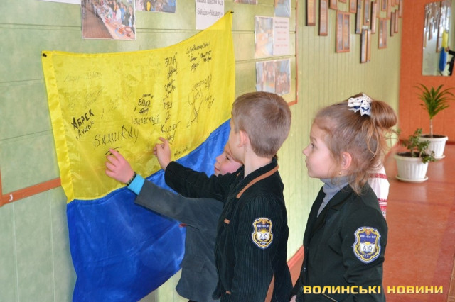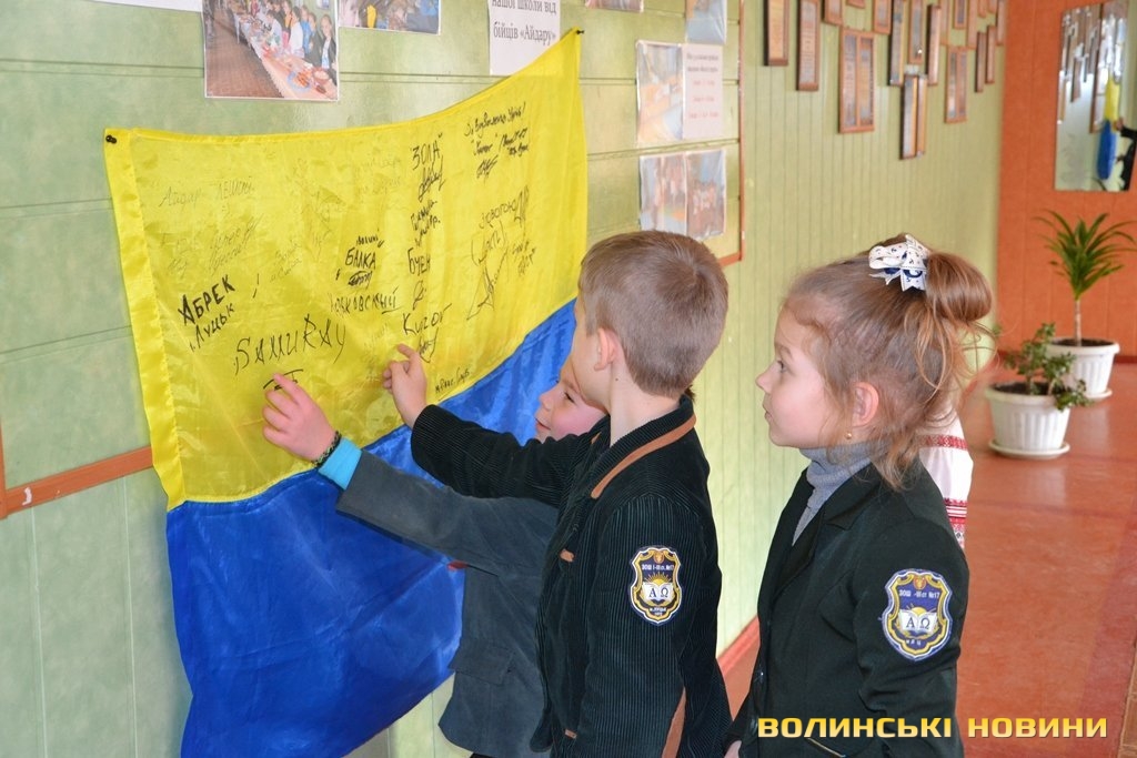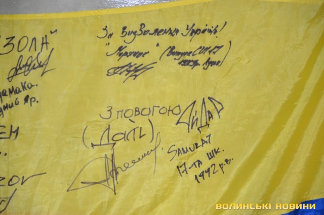 Прапор з передової, розписаний теплими побажаннями та з вказаними позивними, луцьким школярам подарували бійці батальйону «Айдар» у знак вдячності за щирі листи та малюнки, які дітлахи регулярно надсилали захисникам.