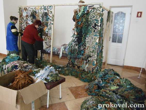 Вже вдруге бібліотекарки міста і району власним коштом і за пожертви містян закупили сітку для виготовлення маскувальної, щоб робота не зупинялася ні на мить. До пункту плетіння щоразу приходить все більше волонтерів. Одні приносять необхідну тканину, інші її розрізають на потрібні смужки, а ще одна група працюючих обв’язує сітку. Якщо до рук невтомних працівниць потрапляє матеріал іншого кольору, тобто не той, що потрібен на даний момент, то жіночки його фарбують, підсушують і віддають в роботу.