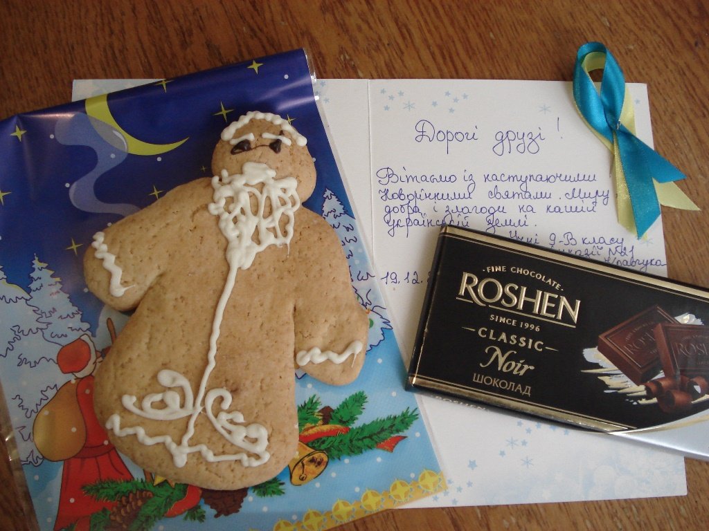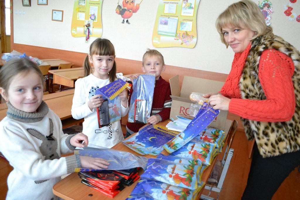 У зв’язку з цим зібрали понад 18 тисяч гривень, за які купили солодкі подарунки. Кожна дитина отримає шоколадку, святкове печиво та листівку.Гімназисти разом із учителями спакували 1200 солодких подарунків і вклали листівки із теплими словами побажань до свята. Школярі старших класів віднесли пакунки на відділенні пошти, звідки їх відправили до навчальних закладів.Сьогодні, в День Святого Миколая, учні Зимогір’ївської, Біловодської гімназій, школи №56 міста Щастя Луганської області та Артемівської школи-інтернату Донецької області отримають подарунки.