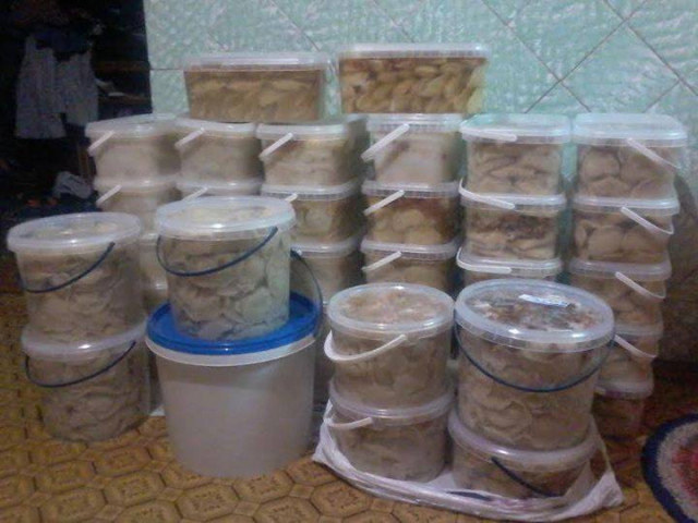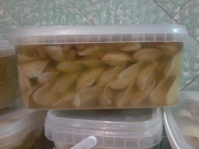 Суть ідеї полягає у тому, що свіжозварені вареники з картоплею кладуться у пластикові відерця і заливаються розтопленим смальцем зі шкварками. Жир застигає і таким чином консервує готові вареники.
