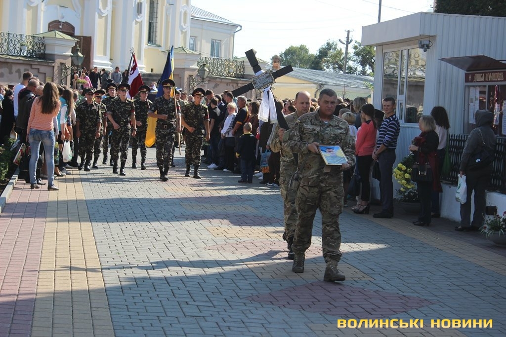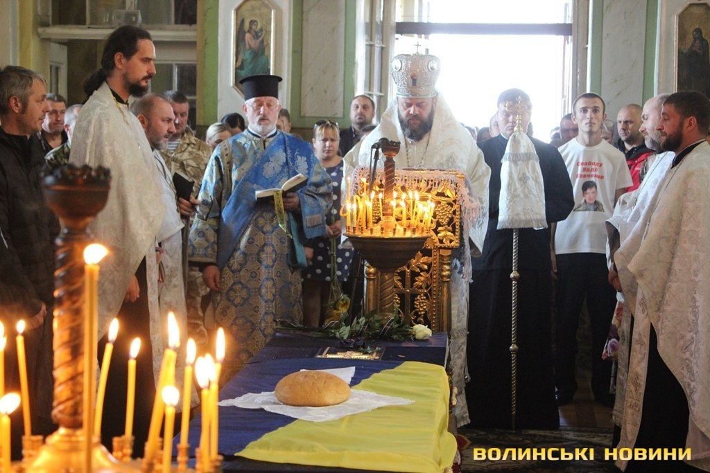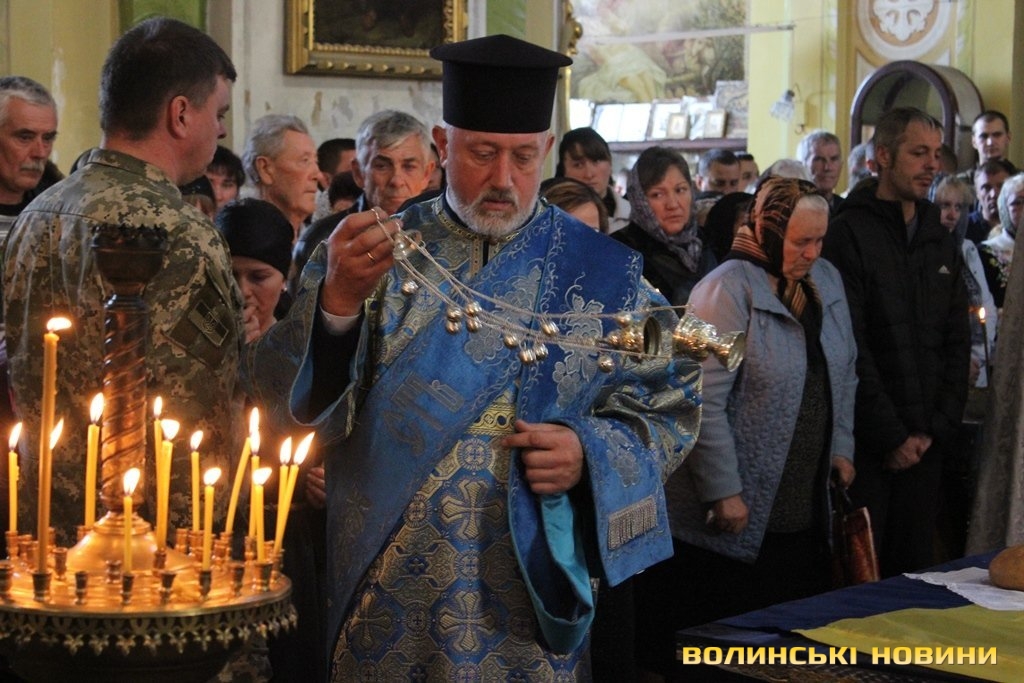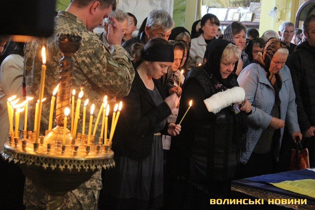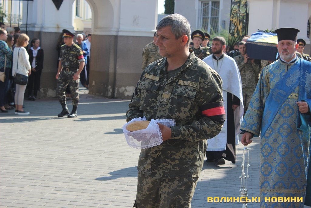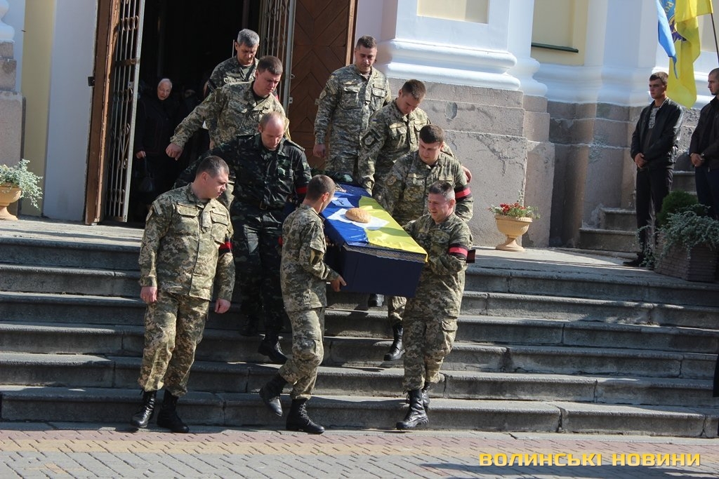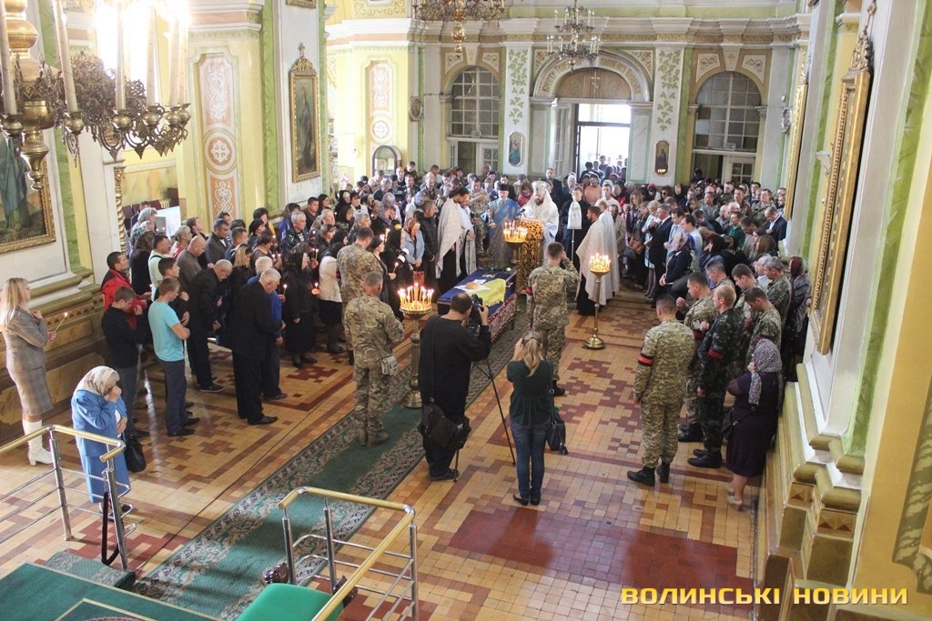 «Скорботний дзвін і новина зібрали нас сьогодні у цьому кафедральному Соборі, щоби провести в останню дорогу з пошаною Героя та воїна, який, захищаючи рідну державу, віддав найцінніше, що у нього було – життя. Людське життя подібне до свічі. Коли вона нова, велика й яскраво горить, на неї усі звертають увагу. Перед нею стоять і моляться, думаючи про сокровенне. І чим більше вона догоряє до кінця, тим все менше ми на неї звертаємо увагу. Але є випадок, коли велика свіча від температури гнеться. І ти думаєш: «Чому? Свічка повинна стояти рівно, але вона зігнулась і не горить». З’являється внутрішній спротив, бо так не повинно бути. Неправильно це, не по-божому, не по-людськи. Але так є. Й сьогодні випробовується душа кожної людини: чого вона варта, які її цінності. Випробовується душа, першою чергою, тих сімей, що випровадили своїх чоловіків на фронт. І ми також, вся громада, розмірковуємо над тим, щоб швидше настав мир. Дякувати Богу, сьогодні маємо перемир’я, не так стріляють і не так масово гинуть наші чоловіки. Але відгомін цієї війни лунатиме ще довго. Ще часто ми будемо проливати сльози, дізнавшись, що знову когось знайшли. Але при цьому ми знаємо, заради чого загинули ці люди – заради України. Воістину великий подвиг здійснює людина, живучи на землі. Але найбільшим подвигом є покласти душу свою за ближніх своїх. Ми гордимось, що є у нас такі чоловіки і це надихає на життя. Вшановувати те, що дає нам Господь нині – кожну мить спілкування, й кожну мить праці. Ми не лише з почестями ховаємо, але найцінніше – це вдячна молитва, і наша пам'ять. Бо ніхто не забутий, і ніщо не забуте», - сказав під час заупокійної проповіді митрополит Луцький та Волинський Михаїл.Після відспівування труну із тілом Героя понесли на Театральний майдан міста. Провести бійця в останній путь прийшли не лише родичі та друзі загиблого, а й небайдужі лучани. Щирих сліз під акорди тужливої пісні-реквієму «Пливе кача» не стримував ніхто.
