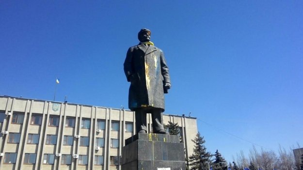 На пам'ятнику Леніну, що впевнено ще тут стоїть, з недавніх пір красується пофарбований жовто-блакитною фарбою піонерський галстук і такого ж кольору патьоки.