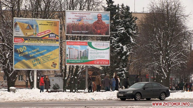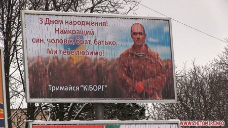«Тримайся, кіборг!» - білбордами з такими написами полоненого командира штурмового батальйону 81-ї десантної бригади підполковника Олега Кузьміних привітали з днем народження друзі, родичі і просто небайдужі люди. Один з білбордів знаходиться на Соборному майдані у Житомирі, інший – на вулиці Вітрука. Про це повідомляє Житомир.info.