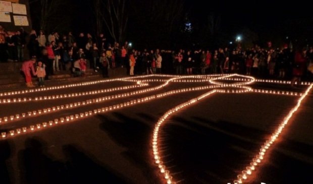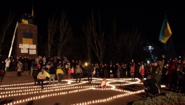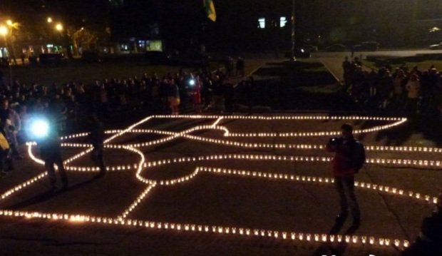 Тризуб зі свічок виклали одночасно у 22 містах України. Акцію задумали, щоб підтримати українських військових у зоні АТО, і показати, що Україна - єдина. У Херсоні на Площі Свободи виклали герб України з 2000 свічок. Сотні херсонців вийшли на акцію показати, що сепаратизму в місті не буде, - йдеться в сюжеті ТСН.