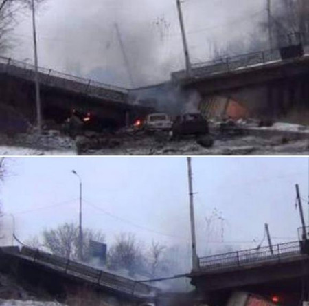 Користувачі соцмереж повідомляють, що одна з найважливіших дорожніх розв'язок міста обвалилась, через потрапляння снаряду. Місцеві жителі повідомляють, що у районі мосту, у першій половині дня, велися активні бойові дії між українськими військовими і бойовиками.