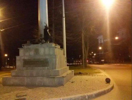 Згыдно з даними прокуратури, 7 квітня близько 3:40 невідомий предмет вибухнув поруч зі стелою з державним прапором на проспекті Правди.