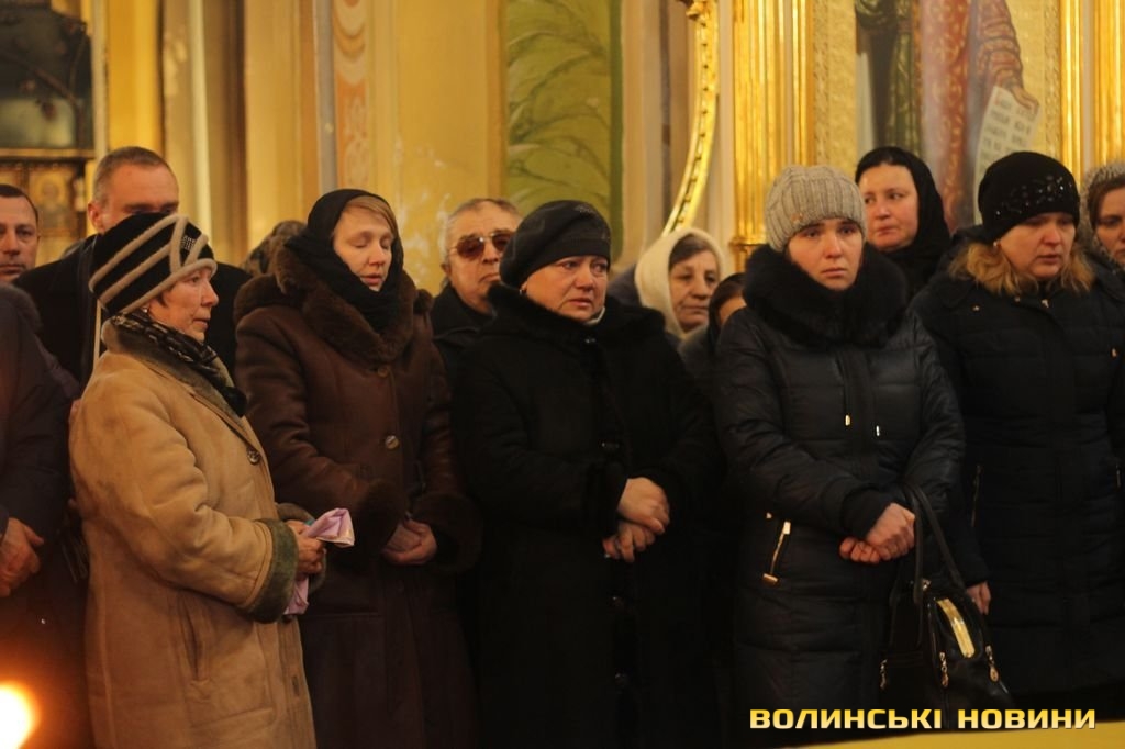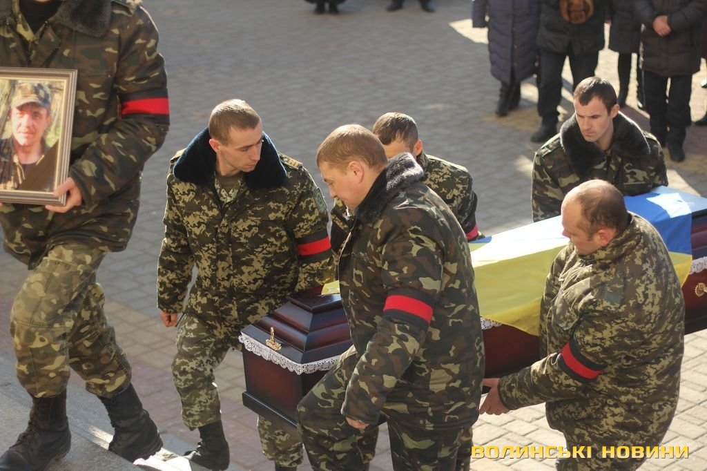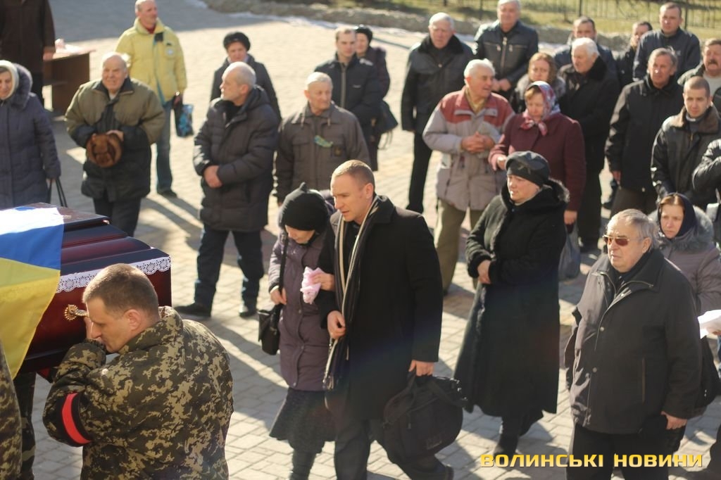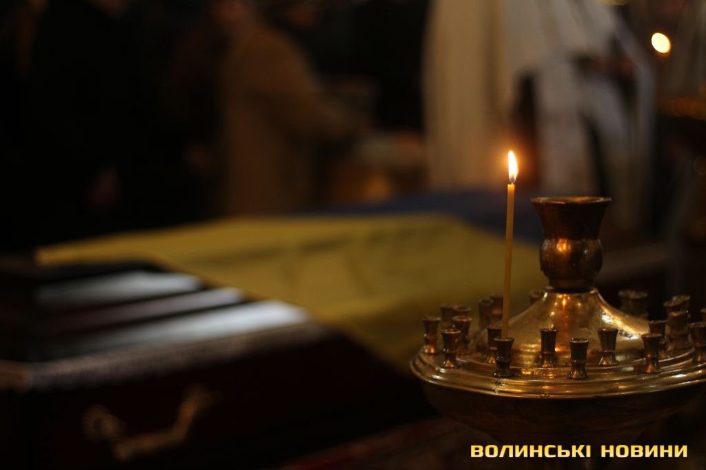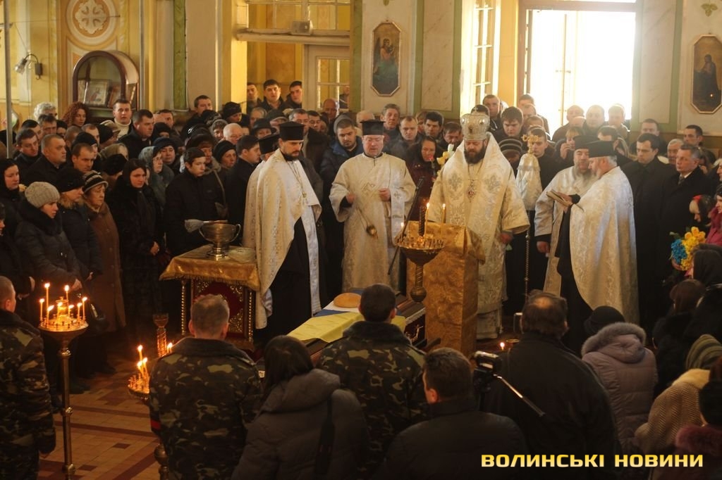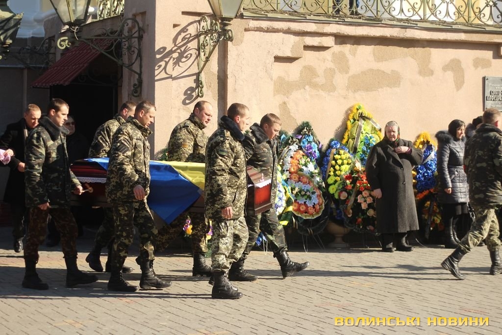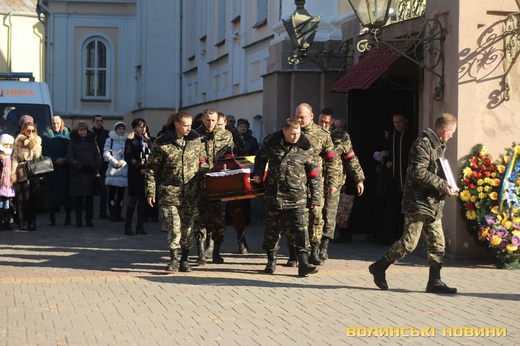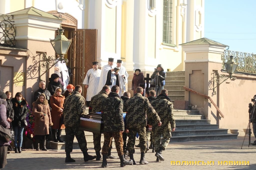 Попри те, що літургія щойно розпочалась, поблизу виходу з храму вишикувались діти з жовто-синіми квітами, таким чином утворивши коридор до центральної частини Театрального майдану.Нагадаємо, боєць з Волині довгий час був у списку тих, хто пропав безвісти. Проте згідно з результатами проведених експертиз вдалось ідентифікувати особу чоловіка. Він у складі 51-ї окремої механізованої бригади виконував завдання у зоні АТО. Зв'язок з ним обірвався 28 серпня 2014 року. На той час він знаходився поблизу Іловайська Донецької області.