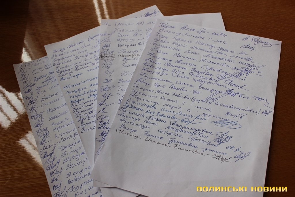 Власне, голова ОДА і голова облради на момент візиту рідних військових були зайняті, зокрема Володимр Гунчик нині в Рожищі з робочою поїздкою. Відтак, прийняв їх перший заступник голови облради Олександр Пирожик і радник голови ОДА Борис Кондратюк. Однак, родичі військових налаштовані рішуче і готові чекати керівництво області хоч і до кінця дня. Вони оформили звернення, зібрали підписи й планують його зареєструвати.