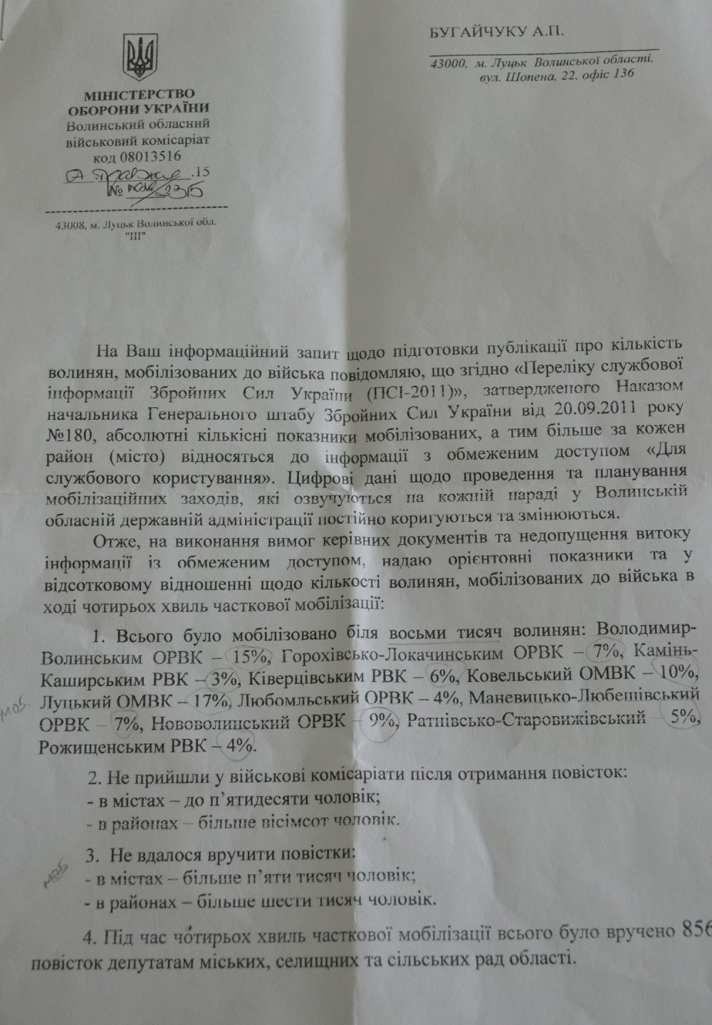 За час війни на сході до лав Збройних сил України мобілізували близько восьми тисяч волинян. Такі дані – за станом на 21 квітня 2015 року. Про це йдеться у відповіді обласного військкомісаріату на запит Волинського Агентства Розслідувань.